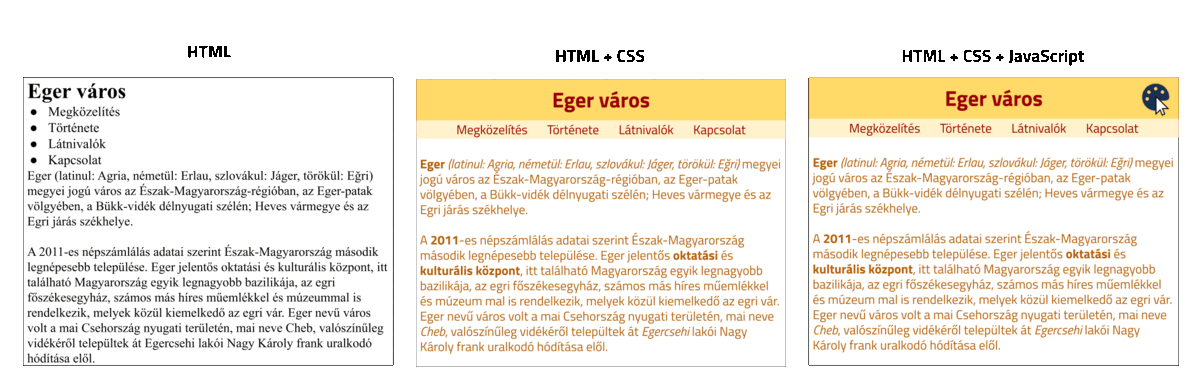 - A CSS felel a tartalmak kinézetéért, elrendezéséért, színekért, egyszerűbb animációkért